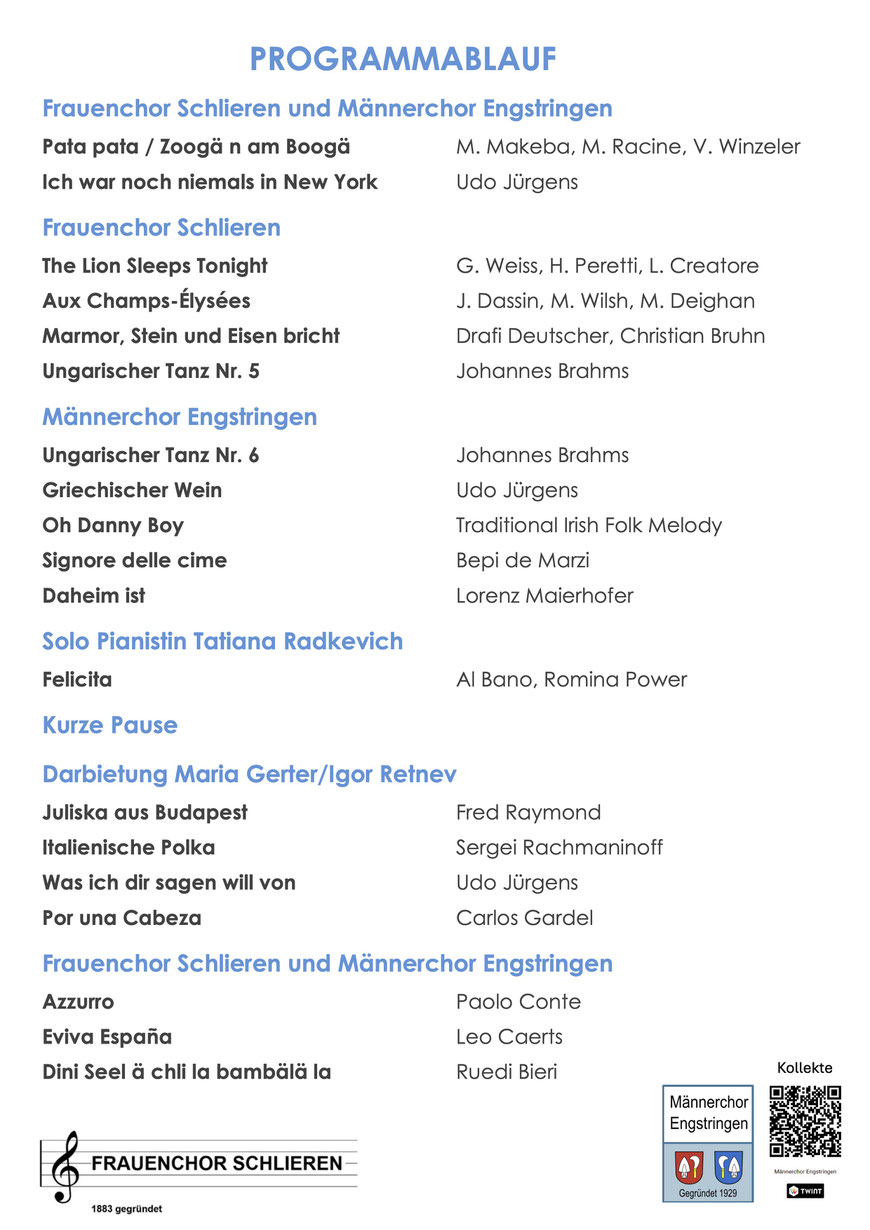 Wir sind ein kleiner Chor mit zurzeit 11 Sänger. Die Proben finden jeweils am Dienstag-Abend statt. Unser Repertoire wird immer wieder neu zusammengestellt und reicht von der Klassik über die Volksmusik und Musical bis zu einfachen Lieder. Wichtig ist für uns ist ein positives Erlebnis und die Freude am Singen. Unser "Highlite" ist die Jährliche "Herbst-Serenade" welche wir zusammen mit anderen Chören und Musiker durchführen. Auch unterstützen wir mit unseren Sängern gerne andere Chöre, welche sich für ein geplantes Konzert über Unterstützung freuen.